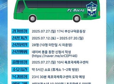FC목포 K3리그 19R 부산교통공사전 원정버스 신청 안내⠀ -경기일정 : 2025.07.27.(일) 17시 부산..