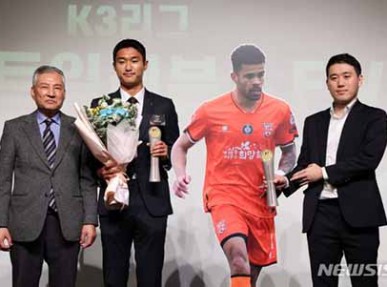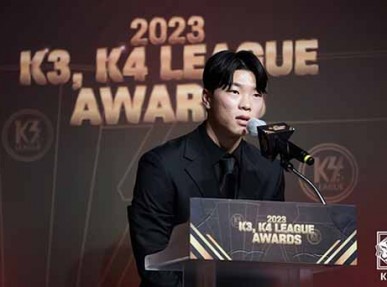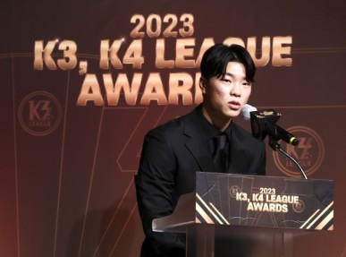 [서울=뉴시스] 황준선 기자 = 7일 오후 서울 종로구 교보생명 컨벤션홀에서 열린 2023 K3, K4 리그 어워즈에서 베..