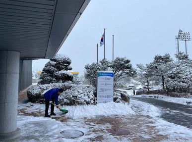 목포국제축구센터 임직원들은 센터 이용객들의 원활한 방문을 위해 제설 작업을 진행했습니다. 방문 시 빙판길 유의하시기 바랍니..